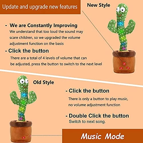 - ใUpgraded Version โ ฃใ: Volume Adjustable There are 3 button can control the funny dancing cactus toys. This Version Which Including Colorful Glowing Recording, Repeating, Dancing and Singing Functions. There are 120 songs in many language it can sing. It can record what you say and repeat your words. Load the batteries and press the button. It will twist his body and glows when singing. It’s really funny so try to speak something to it, which absolutely bring you a happy mood.